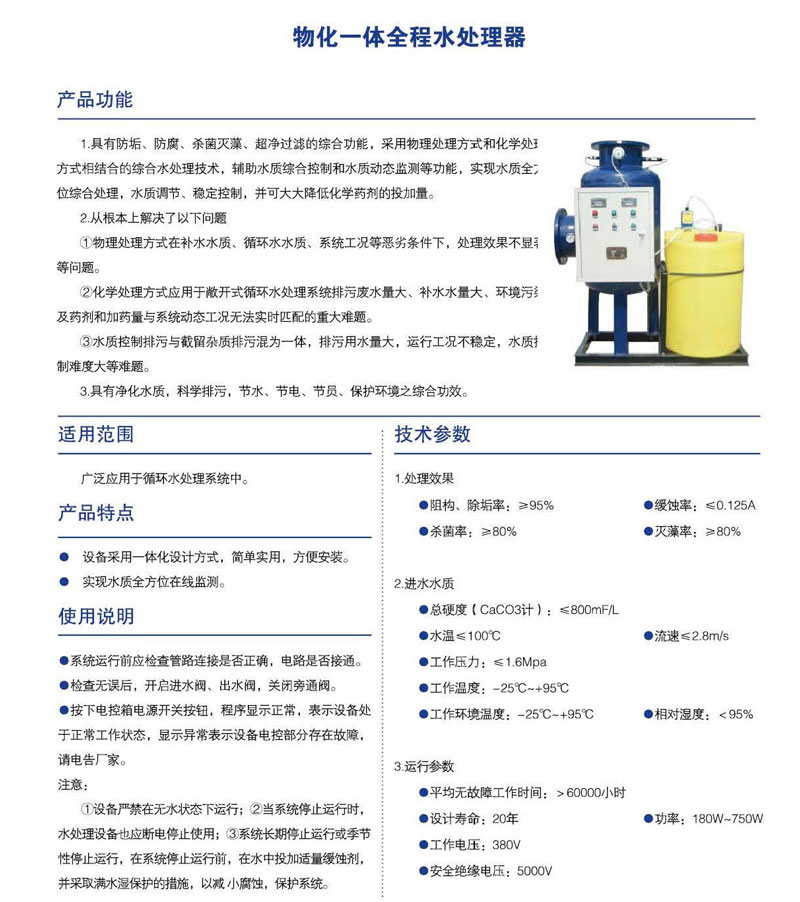 物化一體全程水處理器具有防垢、防腐、殺菌滅藻、超凈過濾的綜合功能,采用物理處理方式和化學(xué)處方式相結(jié)合的綜合水處理技術(shù),輔助水質(zhì)綜合控制和水質(zhì)動態(tài)監(jiān)測等功能,實現(xiàn)水質(zhì)全位綜合處理水質(zhì)調(diào)節(jié)、穩(wěn)定控制并可大大降低化學(xué)藥劑的投加量。
